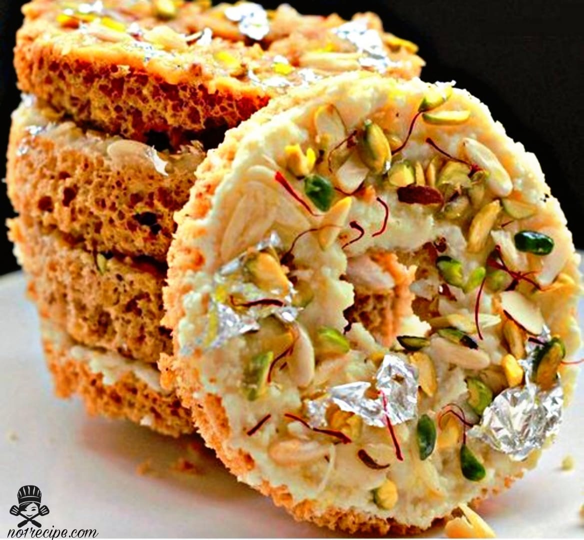 Ghevar is sweet but not too sweet and frequently includes saffron and cardamom for air. The batter is also poured in ghee in a slice shape and is fried to a rosy honeycomb- suchlike a texture.